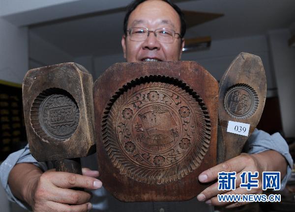 9月19日,天津市民王来华展示雕刻着五星红旗图案(中)和“保家卫国”字样(右)的月饼模子。天津市民王来华从1996年开始收藏月饼模子,十几年来共收藏了近千块具有时代印记和文化底蕴的月饼模子。这些月饼模子上不仅有象征中秋佳节的“嫦娥”和“玉兔”图案,也有代表20世纪50年代抗美援朝时期“保家卫国”的字样;不仅有手掌大小的模子,也有直径达30厘米的大型模子。一个个造型各异的月饼模子见证了时代的变迁。新华社记者岳月伟摄