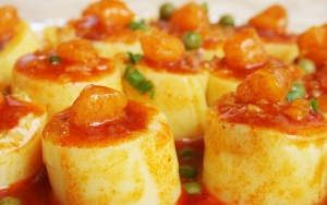 这是一道淮扬风格的菜式,首先用鸡汤与豆浆酿制出风味别具的秘制豆腐,然后用汤匙做出琵琶造型备用。将大闸蟹蒸熟后,师傅们会手工剔取其蟹膏、蟹肉、蟹黄,用花雕酒、鸡油、葱、姜等配料精心炒制成蟹粉,然后再与豆腐烩在一起即可。