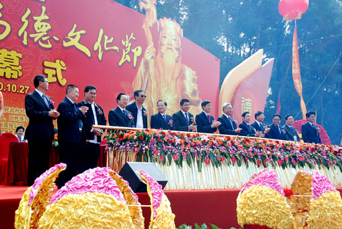 湖里区委书记李栋梁、福建省海峡文化研究会会长杨华基、台湾寺庙金兰会会长王增荣、新加坡道家总会会长陈添来、厦门市政协副主席陈昌生先后在开幕式上致辞。海峡两岸关系协会副会长张铭清宣布第三届福德文化节开幕并邀请在场嘉宾共同推动启动杆启动开幕。现场的嘉宾为福德文化墙和海峡两岸非物质文化遗产(仙岳山)展示中心项目奠基仪式培土。