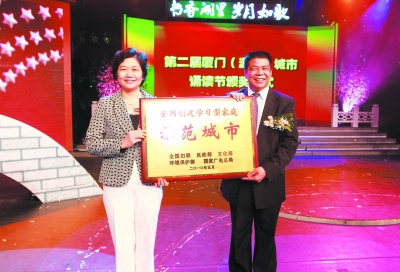 厦门市委常委、宣传部部长洪碧玲(左)向湖里区委书记李栋梁颁发“全国创建学习型家庭示范城市”奖牌 黄嵘 摄