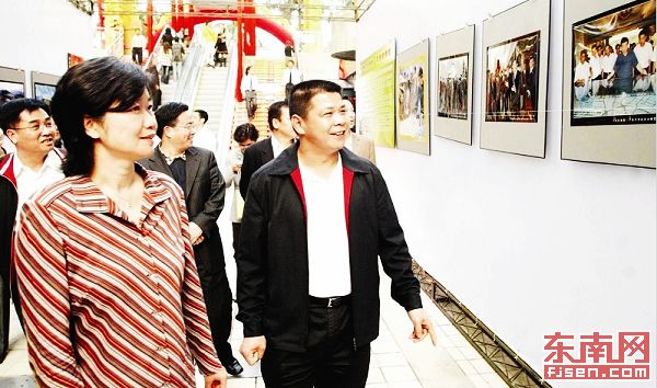 厦门市委常委、宣传部长洪碧玲(左),湖里区委书记李栋梁(右)等领导,参观非物质文化遗产。