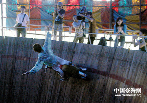 中国台湾网8月17日沈阳消息 高速飞驰的机车,陡峭如立的绝壁,以及各种高难的特技动作,很难想像这三者竟能完美合一。日前,台湾中时传媒采访团便在沈阳欣赏到了这难以置信的人间绝技——“飞车走壁”。