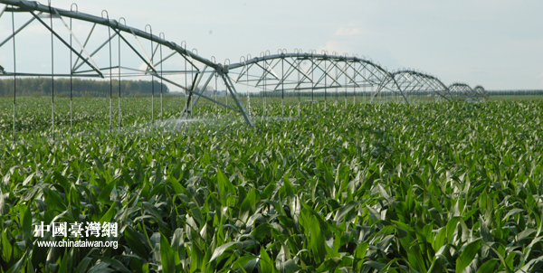 全省产粮第一镇的肇东五里明镇玉米吨良田里的圆心自走式喷灌机(中国台湾网 李徽 摄)