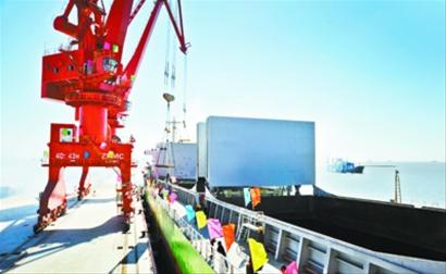 今年以来,盘锦市大力推进荣兴港、疏港铁路建设,并启动沈盘铁路建设。目前,荣兴港一期工程实现通航,围绕港口建设的疏港铁路将在2011年底全线贯通。图为货轮在荣兴港万吨级泊位装载货物。(万重 摄)