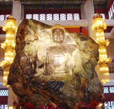 “玉石王”是一块七彩花玉,各部位的颜色用现有的科学技术尚无法探明,人们担心将佛面雕成花脸,但雕刻结束时,人们惊奇地发现,佛祖的面部恰恰刻在一块纯净的墨绿色玉块上,佛面灵光,神韵倍增,而佛祖的金冠恰逢一块淡黄色的玉面。在整体上,颜色恰巧搭配成法相庄严的释迦牟尼佛身披黑白相间的袈裟,打坐在莲花宝座上,周围七彩祥云缭绕,给人以心灵的震撼和慰藉。同样,观音的面部也恰好位于一块晶莹剔透的淡绿色玉面上。玉佛雕刻之完美可谓巧夺天工。