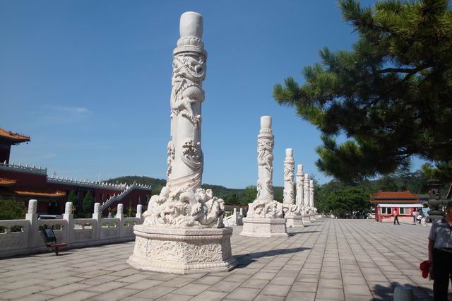 立柱是古建筑的主要构建,立柱不仅具有很强的“力”的功能,而且对建筑体的风格、造型起着重要的装饰作用。玉佛阁有102根立柱,除90根为钢筋混凝土浇灌、八角棱形大理石贴面的立柱外,另有12根高7.2米、直径0.9米,以高浮雕手法雕刻而成的汉白玉蟠龙玉柱。蟠龙玉柱以两根为一组,成对称式。每根柱上雕有两条巨龙,为升龙和降龙组成的二龙戏珠图案。特别是大殿正面中间的两根,每根雕有两条大龙、一条小龙。小龙在下面,一条大龙吐出的云气中飘然升腾,上面一条大龙俯视着飞腾着的小龙,象征着“望子成龙”之意。这12根蟠龙玉柱的挺立,使得玉佛阁格外壮观,这又是玉佛苑建设中的一绝。