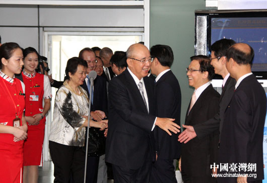 7月10日13时20分许,出席“第五届两岸经贸文化论坛”的中国国民党主席吴伯雄一行,乘机抵达长沙黄花国际机场。(中国台湾网 钟宝华 摄)