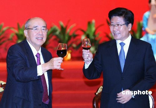 第五届两岸经贸文化论坛7月11日在长沙开幕,当晚,东道主湖南省委举行晚宴招待论坛嘉宾。图为中国国民党主席吴伯雄(左)与中共湖南省委书记张春贤共同举杯庆祝论坛开幕。 中新社发 宋吉河 摄