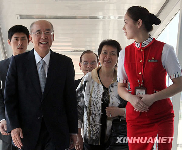 7月10日,中国国民党主席吴伯雄率团抵达长沙,出席即将于7月11日至12日在长沙举行的第五届两岸经贸文化论坛。新华社记者 邢广利摄