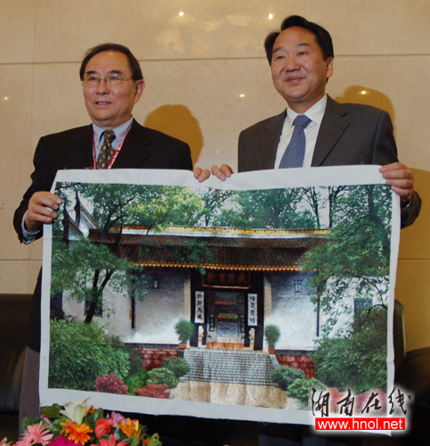 蒋建国部长向牟宗灿团长赠送湘绣《岳麓书院》