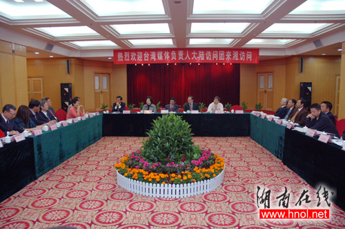 湖南日报集团覃晓光社长向台湾访问团团长牟宗灿介绍集团情况