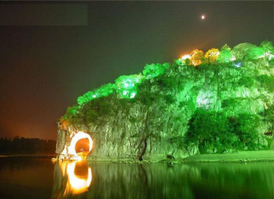 桂林象山,象鼻和象身中间有一水月洞,江水从洞中横贯而过。中秋之夜,乘小舟作江上游,驶入水月洞,便见“水底有明月,水上明月浮;水流月不去,月去不还流”的绝妙景观。