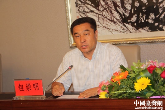 鄂尔多斯市副市长包崇明向全国知名网络媒体记者介绍鄂尔多斯经济社会发展情况。(中国台湾网 王文英 摄)
