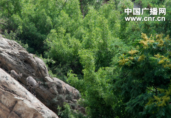 宁夏银川市,贺兰山岩画景区,岩羊母子在优美的环境中散步。