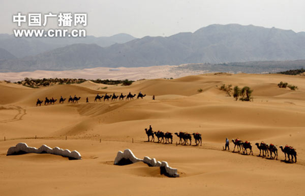 宁夏中卫市沙坡头景区,勤劳的骆驼接送游客。