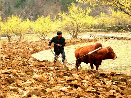在灿如金霞的山茱萸园林旁,佛坪农户正在春耕。改革开放30年来,该县着力构建粮油、绿色中药、林果、生态旅游等多元互补产业新格局,助农增收。去年农民人均纯收入达2012元,比1978年增长24.8倍。记者 徐秦生 通讯员 吴燕峰摄