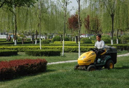 4月10日,一名工人在宝鸡市市民广场修整草坪。