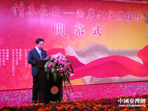 陕西省副省长郑小明在开幕式上指出,陕西是中华民族和华夏文明的重要发祥地,西安是古代丝绸之路的起点,世界著名的古都和历史文化名城,近年来的陕台间文化交流活动十分活跃,秦始皇兵马俑展、陕西文物精华展、汉阳陵文物展、法门寺佛指舍利赴台供奉等一系列活动,加深了两岸同胞间的了解,增进了同胞情谊。他代表陕西3780万人民热情欢迎来自海峡两岸的文化界嘉宾。