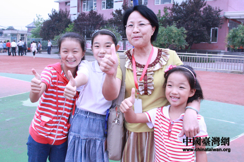 台湾云林县北辰小学校长丁招弟和同学们合影 (中国台湾网 董洁 摄)