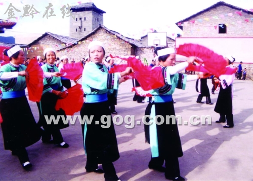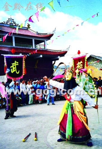 鲍屯有一种古老而神奇的武剧,过去人们叫它“跳神”。其实,这种武戏是一种在我国北方、中原、沿海等地早已失传的古“军傩”是鲍屯人的始祖最早把它引进到安顺地区并保存至今的军事戏剧的“活化石”。因为它与战争有密切关系,我们又叫它战争舞蹈,简称“战舞”。