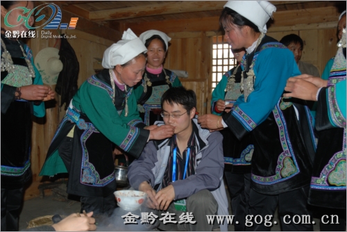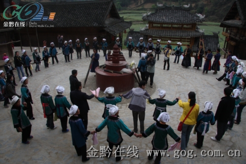 在水族原生态村落姑鲁寨,记者们受到了当地水族人的热烈欢迎,与水族人一起舞蹈,并参加他们祭祀活动。