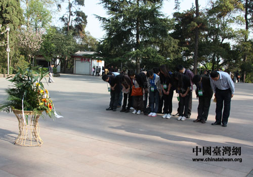 网络媒体记者向烈士纪念碑敬献花篮(中国台湾网 李丹 摄)