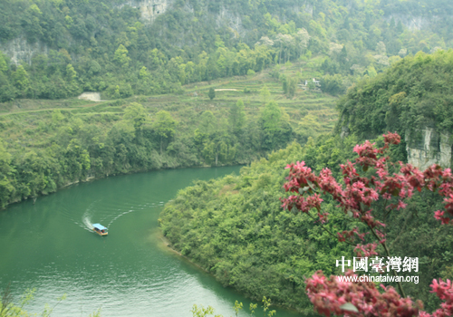 中国台湾网4月12日遵义消息 青峰如屏倒影江中,景色奇幻多姿多彩。中国网络媒体贵州行“红色之旅”一行昨日上午来到遵义云门囤景区,观赏原生态奇观,放飞心情,回归自然,体会云门囤沉静质朴、雄奇秀丽的天然之美。