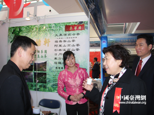 中共中央统战部副部长尤兰田在台湾展区品尝茶产品,称赞道:“台湾茶,很好喝”。