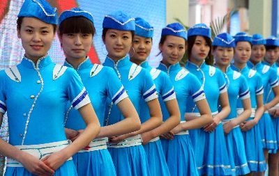 展位前的礼仪小姐引人注目。本组图片由记者侯智拍摄
