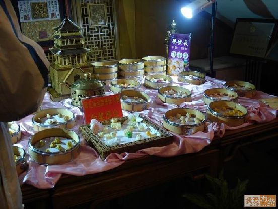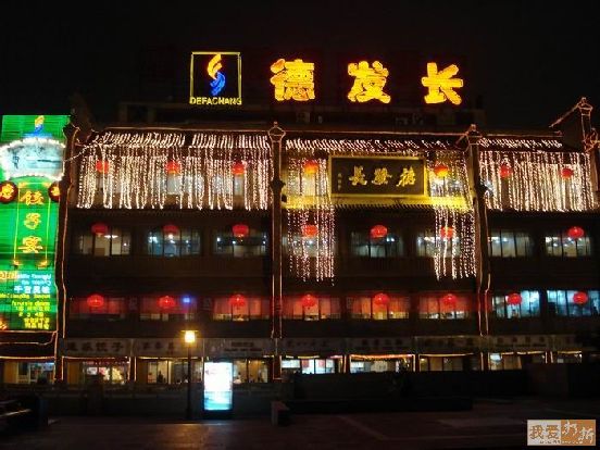 在西安老家过10.1,家里来了长期住在香港的亲戚。来了点名要吃西安的“饺子宴”,说在海外是跟全聚德的烤鸭相当名气的东东。于是就去预订了,那里一般都要预订,而且吃饺子宴一般都是包间。俺们订的还是最低标准的,80米/位。据说是有16道不同的饺子,8道凉菜,3道小吃,1道汤,普通饺子敞开吃,管够。德发长,在钟鼓楼广场边上,恢常恢常醒目,俺们是晚上去的,只照了夜景。那天还下着雨,nnd,吃个东东真不容易啊。