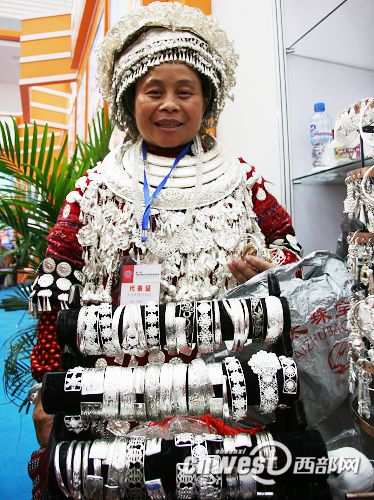 记者了解到,这位妇女来自贵州省,是苗族人。她还告诉记者一个有关苗族人的银饰风俗。据她介绍,苗族的女孩从出生那天起家人便会每年为其打制一枚银饰,一年一件积累起来,待到少女将要出嫁时,便能凑齐这样一身的银饰了。