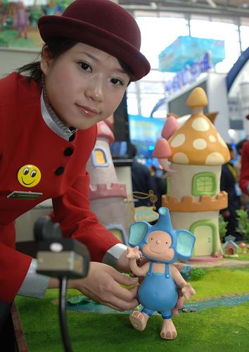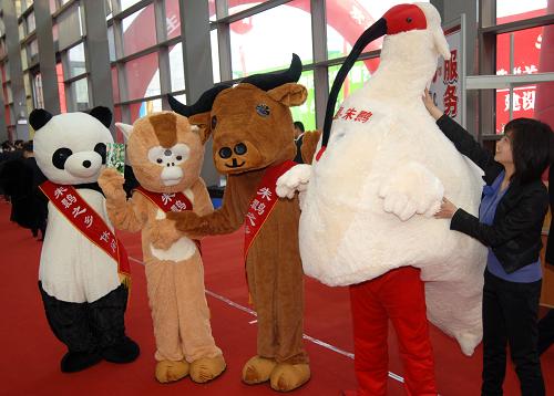 4月8日,在西安曲江会展中心,陕西洋县的参展人员用卡通造型展示生活在其境内的大熊猫、金丝猴、羚牛、朱鹮等珍稀野生动物。