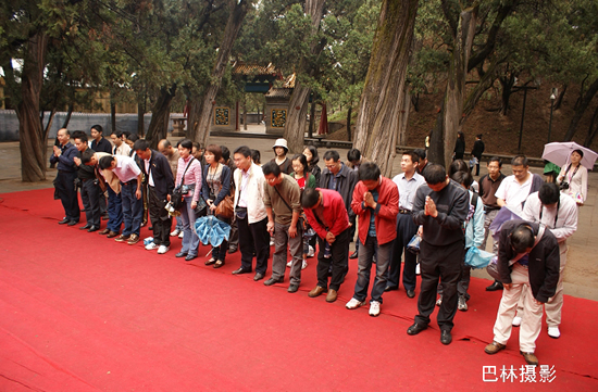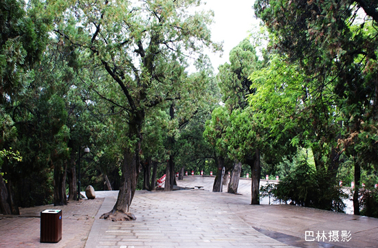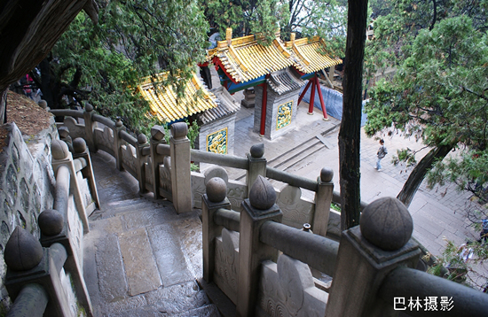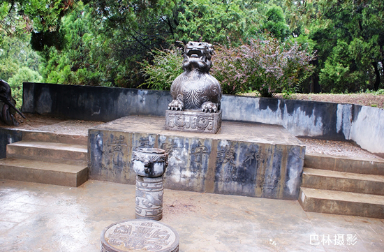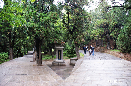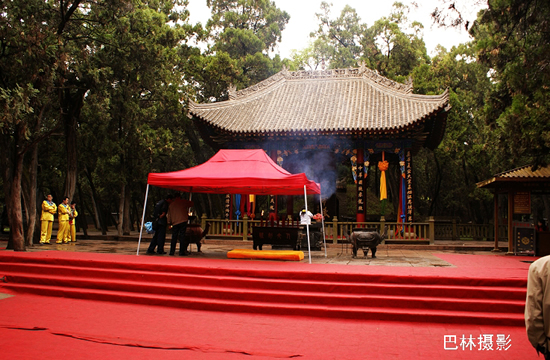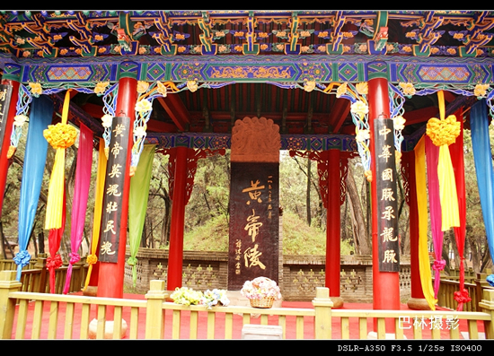 从黄帝陵往前,就有陵区内最主要的建筑“人文初祖”殿。人文初祖殿初建于明朝,后代屡有修缮,它占地283平方米,面阔七间、进深三间。门额上悬挂着程潜先生于1938年祭陵时所题写的“人文初祖”四个大字。祭亭内红柱绿瓦,四角飞檐,亭中石碑刻“黄帝陵”三字,是郭沫若先生1958年所书。(网友:巴林)