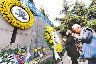 4月5日,南京大屠杀遇难同胞亲属、大屠杀幸存者、南京各界代表聚集在侵华日军南京大屠杀遇难同胞纪念馆内的遇难者名单墙前,举行祭奠活动。记者 韩瑜庆摄