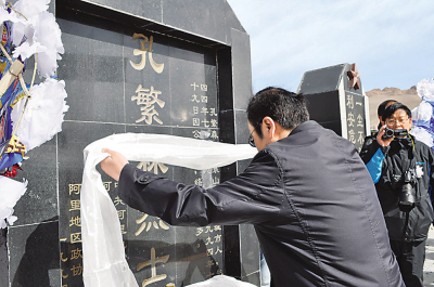 4月5日,西藏阿里地区各族干部群众、中小学生、驻地军警官兵5000余人来到狮泉河烈士陵园,缅怀进藏英雄李狄三、孔繁森等先烈。图为群众向孔繁森烈士墓敬献哈达。蒋先平摄(新华社发)