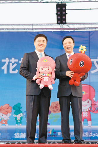 陕西省委常委、西安市委书记孙清云与台北市市长郝龙斌为落户台北花博会园区的“长安花”揭幕