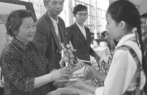 1991年6月1日,全国劳动模范、著名小学教师斯霞在为江苏南京师范大学附属小学优秀学生发奖。斯霞1956年加入中国共产党。1922年就读于杭州女子师范学校。1927年毕业后,先后在浙江绍兴、嘉兴、萧山、杭州及江苏南京等地小学任教。上世纪五十年代,她创造出“字不离词、词不离句,句不离文”的小学语文随课文分散识字教学法,大面积、高效率地提高了识字教学的质量。她教的学生在两年内就认识了2000多个汉字,读了174篇课文,在当时国内小学教育界首屈一指。六十年代,经专家学者总结、论证,斯霞的“以语文教学为中心,把识字、阅读、写话三者结合起来”的小学语文教学法,在全国产生广泛影响。2004年1月12日,斯霞在南京逝世,享年94岁。 | 1949年以前,中国的基础教育十分薄弱,教育发展最高年的1946年,全国只有幼儿园1300所,小学28.9万所,中学4266所。1949年中华人民共和国成立后,中央和地方各级政府非常重视发展基础教育,投入大量的人力和财力普及教育。特别是1978年改革开放以来,中国的基础教育事业进入了一个新的发展时期。1985年中共中央发布的《关于教育体制改革的决定》中提出了“实行基础教育由地方负责,分级管理的原则”,从而极大地调动了地方各级政府,尤其是县、乡两级政府办学的积极性。1986年全国人民代表大会颁布《中华人民共和国义务教育法》,使中国的基础教育走上了法制的轨道。1993年中共中央、国务院发布《中国教育改革和发展纲要》,明确了到本世纪末中国基础教育的发展方向和基本方针。1999年初国务院批转了教育部制定的《面向21世纪教育振兴行动计划》,这一计划是教育战线落实“科教兴国”伟大战略的具体举措,是在落实《中华人民共和国教育法》及《中国教育改革和发展纲要》基础上提出的跨世纪教育改革和发展的施工蓝图。6月,中共中央、国务院发布了《关于深化教育改革,全面推进素质教育的决定》,为构建21世纪充满生机活力的具有中国特色的社会主义教育体系指明了方向。