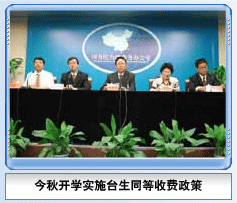 为鼓励和支持台湾学生到祖国大陆高等学校和科研院校学习、深造,维护其切身利益,经大陆有关部门积极会商,决定自2005年秋季入学起实行台生同等收费政策: