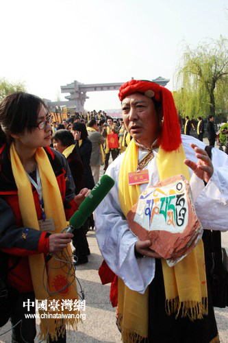 一位少数民族参会者在展示他带来的祈福艺术品。(中国台湾网马迪摄)