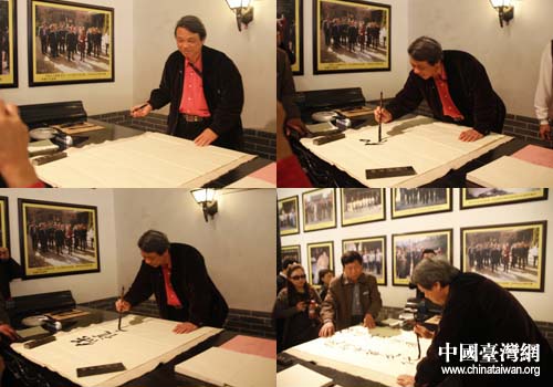 中国台湾网4月10日南阳消息 4月9日,“2011年两岸记者联合采访河南”采访团一行来到中国历史文化名城——河南南阳采访参观。置身楚汉文化发祥地,两岸记者感慨万千,台湾记者即兴挥墨题词,倡导保护文化资产、复兴中华文化。