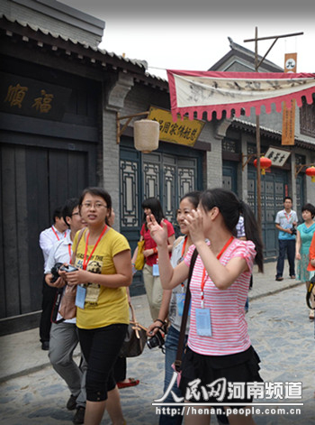 在位于郑州荥阳市广武镇樊河村东北角的中原影视城,作为40集电视连续剧《大河儿女》的外景地,众多采风团成员纷纷表示出极大兴趣。在影视城的西大街,高大的牌坊,让每个人耳边依稀响起冰糖葫芦的叫卖声、磨刀磨剪子的吆喝声,更让人想到馋人的胡辣汤味道、河南烩面的诱人浓香。而朱仙镇木版年画、长垣老杨家炸八块、安阳胡赖三狗皮膏药、商水李四妞疙瘩汤、信阳永昌茶彩旗飘扬,则令人置身于清末那个纷乱而精彩的时代……