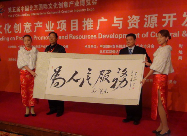 文博会组委会办公室副主任、北京市贸促会副会长倪跃刚接受艺术家为文博会创作的书法作品