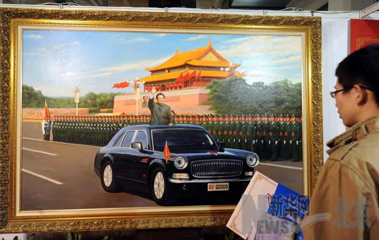 11月18日,一名观众在欣赏油画《盛世中国》。当日,“盛世中国”系列油画在第五届中国北京国际文化创意产业博览会上展出。据介绍,“盛世中国”系列主题油画包括《2008·一月雪》、《共瓷》、《和谐颂经》、《盛世中国》四幅,是两位画家历时近两年时间创作完成。