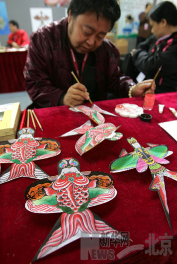 11月18日,民间艺人在北京文博会上现场制作微型风筝。
