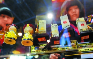 帝后调味罐、唐三彩手机链、八旗娃娃存钱罐……今天上午,在国展5号展馆,500余件“北京礼物”首次集中亮相,3500平方米的展台抢尽了风头。记者看到“北京礼物”中有被称为“燕京八绝”的景泰蓝技艺、雕漆技艺等众多非物质文化遗产,有代表新北京十六景金、银章,还有结合高科技的水立方笔筒、京剧脸谱太阳能娃娃等,很多传统礼物穿上时尚的外衣后,就获得了新生命。上午30件独具特色的“北京礼物”还从全国8000件备选作品中脱颖而出,获得大奖。