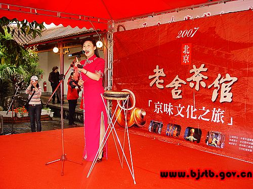 2007年1月2日至11日,由北京老舍茶馆演出人员组成的,集京味文化、茶文化、戏曲文化于一身的第七届“京味文化之旅”展演团,应台湾中华中道学会邀请来到宝岛台湾,先后在云林县虎尾镇布袋戏主题馆、台中耕读园、台北县坪林茶叶博物馆、台北县淡水红楼茶馆、台北紫藤庐茶艺馆和莺歌镇活动中心进行了四场演出和两场交流。老舍茶馆独具浓郁京味、京腔、京韵特色的展演,被誉为“茶与文化艺术的结合”,令岛内民众看得如醉如痴,场场爆满,受到了大批观众的喜爱。很多台湾观众看完演出后意犹未尽,纷纷表示要到北京来看一个“原汁原味的老舍茶馆”。