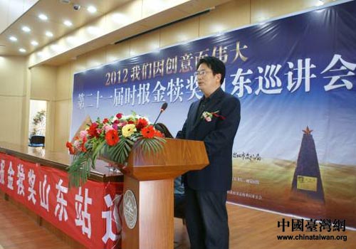 中国台湾网4月25日济南消息 日前,“第二十一届时报金犊奖山东站巡讲会”在山东大学法学院礼堂举行。旺旺集团济南分公司总监李丹、金犊奖组委会代表、旺旺中时传媒总经理助理林洛安先生、北京杰尔思行广告有限公司执行创意总监龙杰琦先生、山东大学艺术学院副院长李平教授及来自山东十余所高校的师生近五百人参加会议。与此同时,“往届金犊奖优秀获奖作品展”在山东大学艺术学院举办。市台办宣传调研处陪同台胞参加活动。