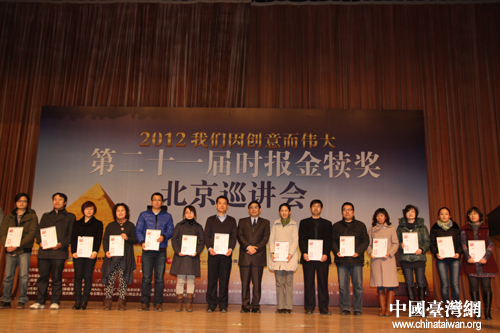 中国台湾网3月7日北京消息 今天下午,第21届时报金犊奖首场巡讲会在中国传媒大学如期举行;该奖行走海峡两岸21年、培养了无数广告创意人才。当天,来自北京、天津、河北等省市的30余所高校的近千名师生代表与会,高涨的参与热情温暖了北京的早春。