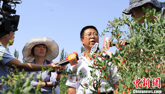 7月30日两岸记者走进宁夏中卫市中宁县万亩枸杞园。图为中宁县枸杞办公室负责人接受在枸杞园接受两岸记者采访。中新社发 石龙洪 摄