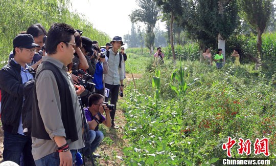 7月30日两岸记者走进宁夏中卫市中宁县万亩枸杞园。图为两岸记者在枸杞园采访。中新社发 石龙洪 摄
